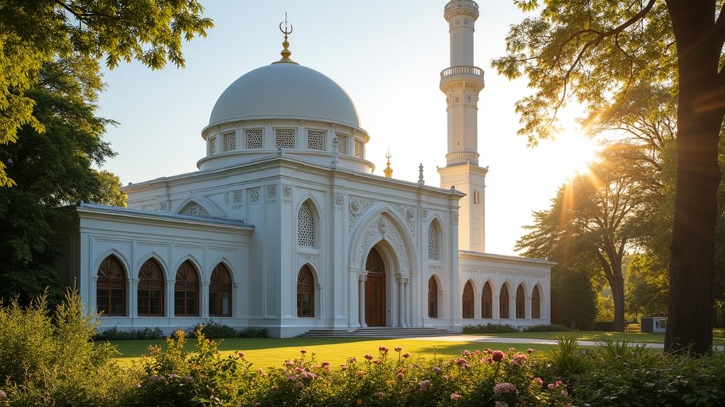 Regents Park Mosque is open daily from 10 AM to 9 PM without requiring tickets for daily prayers or access to its Islamic exhibition. Visitors must follow a modest dress code, including headscarves for women in prayer areas, with scarves often available on-site. The mosque features a large golden dome, a 140-foot minaret, and a grand prayer hall accommodating over 5,000 worshippers. Its Islamic exhibition offers educational displays suitable for all visitors. Additional details reveal more about this cultural site.